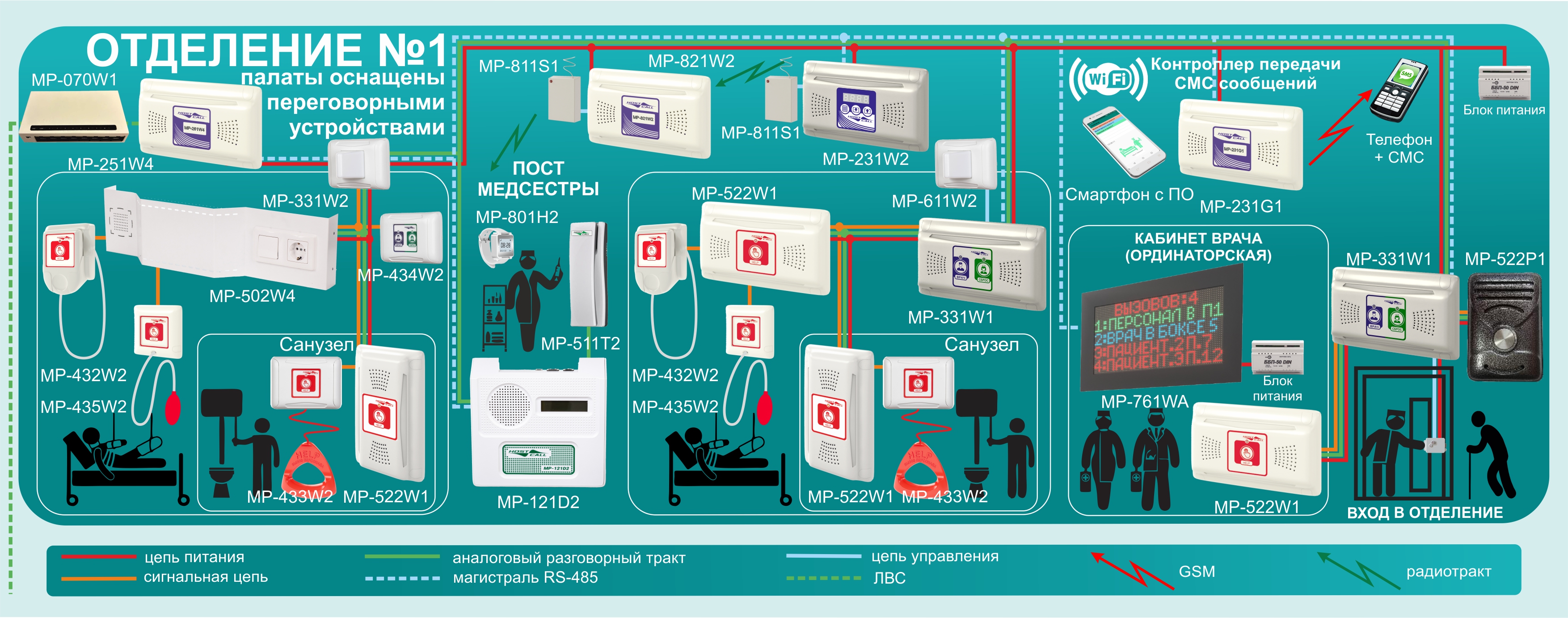 Оснащение медицинских палат переговорными устройствами позволяет персоналу заранее узнать причину вызова осуществив переговоры с пациентом с поста медсестры или с помощь радиотрубки подключенной к пульту MP-121D2. Максимальный состав оборудования палаты с переговорными устройствами громкой связи включает: - палатная консоль MP-331W1 - 1шт. (безусловное требование); В палате у пациентов можно устанавливать как переговорный устройства MP-522W1 так и консоли пациентов MP-502W4. Консоль пациента MP-502W4 оборудована кнопкой вызова, встроенным переговорным устройством и источниками света, которые предназначены как для освещения палаты, так и для индивидуального освещения места пациента. Переговорные устройства MP-522W1 подключаются к палатной консоли MP-331W1 6-ти проводной линией как по схеме «звезда», так последовательным шлейфом (2-х проводная цифровая линия, 2-х проводная линия разговорного тракта, 2-х проводная линия питания 12В.). При этом каждое переговорное устройство имеет дополнительные клеммы для «транзитного» подключения следующего устройства. К переговорным устройствам можно подключить выносную кнопку вызова для лежачих больных MP-432W2. На рисунке представлена структурная схема палаты с переговорными устройствами громкой связи. В мультфильме показаны основные особенности системы палатной сигнализации HostCall-CMP с переговорными устройствами.