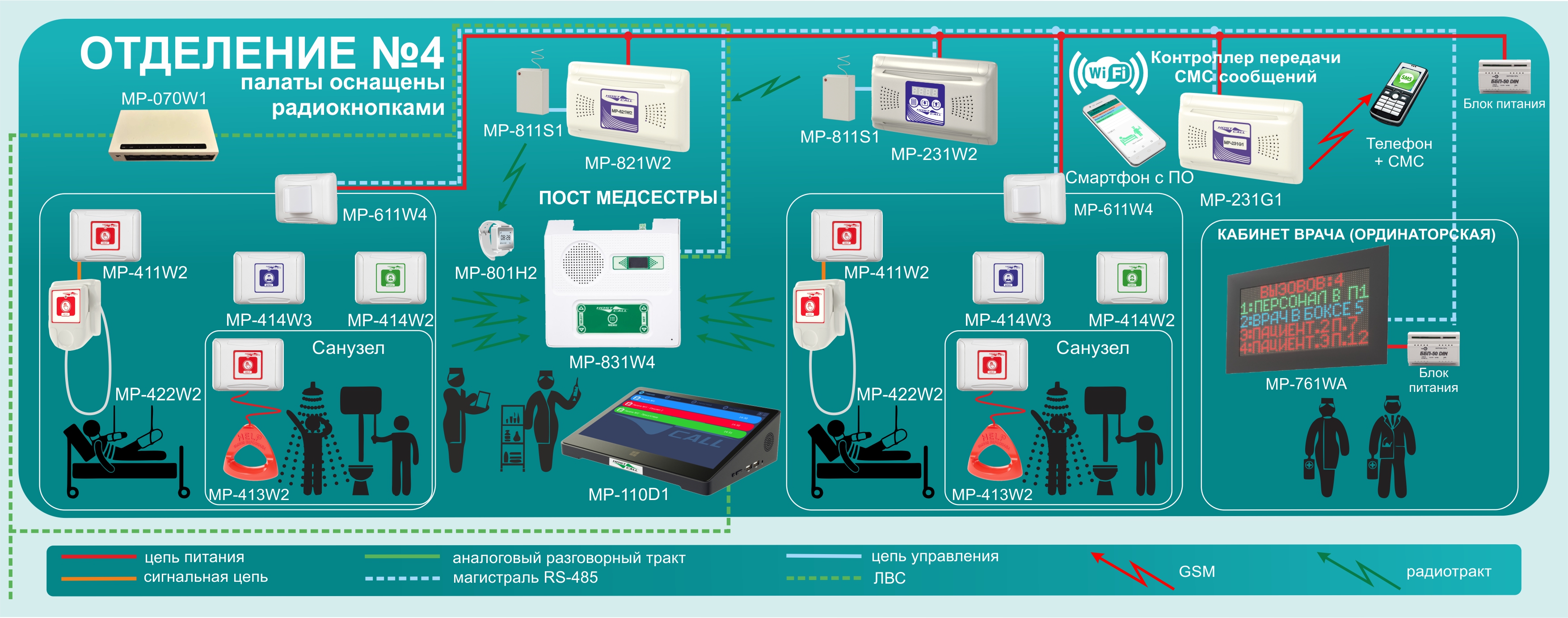 В Отделении № 4 радиокнопки монтируются в палатах и санузлах. Сигналы вызова принимаются Радиоприемником MP-831W4 (устанавливать MP-831W4 рекомендуется в зоне наилучшего приема сигнала от радиокнопок). Радиоприёмник MP-831W4 обрабатывает полученные вызовы и передает их по локальной сети на пульты MP-110D1 и другие компьютеры (с ПО HostCall Nurse), подключенные в локальную сеть и настроенные на работу с этим больничным отделением. Если необходимо над каждой палатой установить сигнальную лампу и/или контроллер передачи СМС-сообщений о поступивших вызовах MP-231G1, то требуется проложить сеть RS-485 от радиоприемника MP-831W4 последовательно через все сигнальные лампы MP-611W4, MP-231G1 и установить одно табло отображения вызовов MP-761WA (в режиме Master).