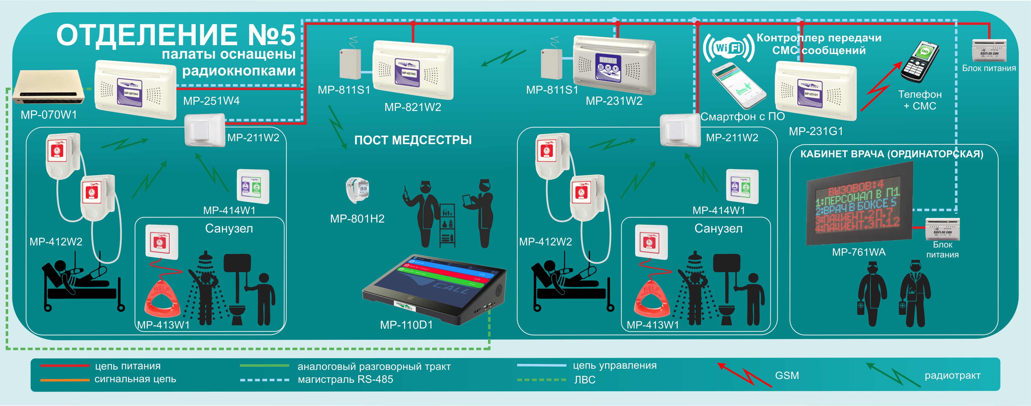 Максимальный состав оснащения одной палаты с радиокнопками вызова включает: Общее количество радиокнопок вызова в санузле не должно превышать 2 шт. Радиокнопки могут применятся в различных учреждениях здравоохранения, в том числе при оснащении госпиталя при коронавирусной инфекции. На рисунке представлена структурная схема палаты с радиокнопками вызова. В мультфильме представлены основные особенности системы палатной сигнализации HostCall-CMP с радиокнопками вызова. |